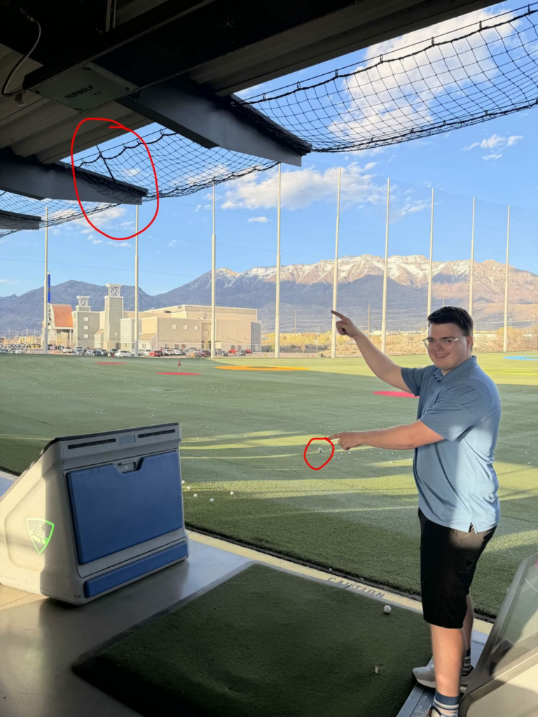 One of his fellow golfers suggested a slight change to his technique, and I guess the combination of the sweaty hands and the attempt to try something a little new led to him completely missing the ball and letting the club slip out of his grip. The club (which was a Top Golf rental that comes complimentary with Luke’s special membership) flew into the ceiling and split in half, the head of the club flying out fifteen yards into the range and the grip getting stuck in the netting overhead.